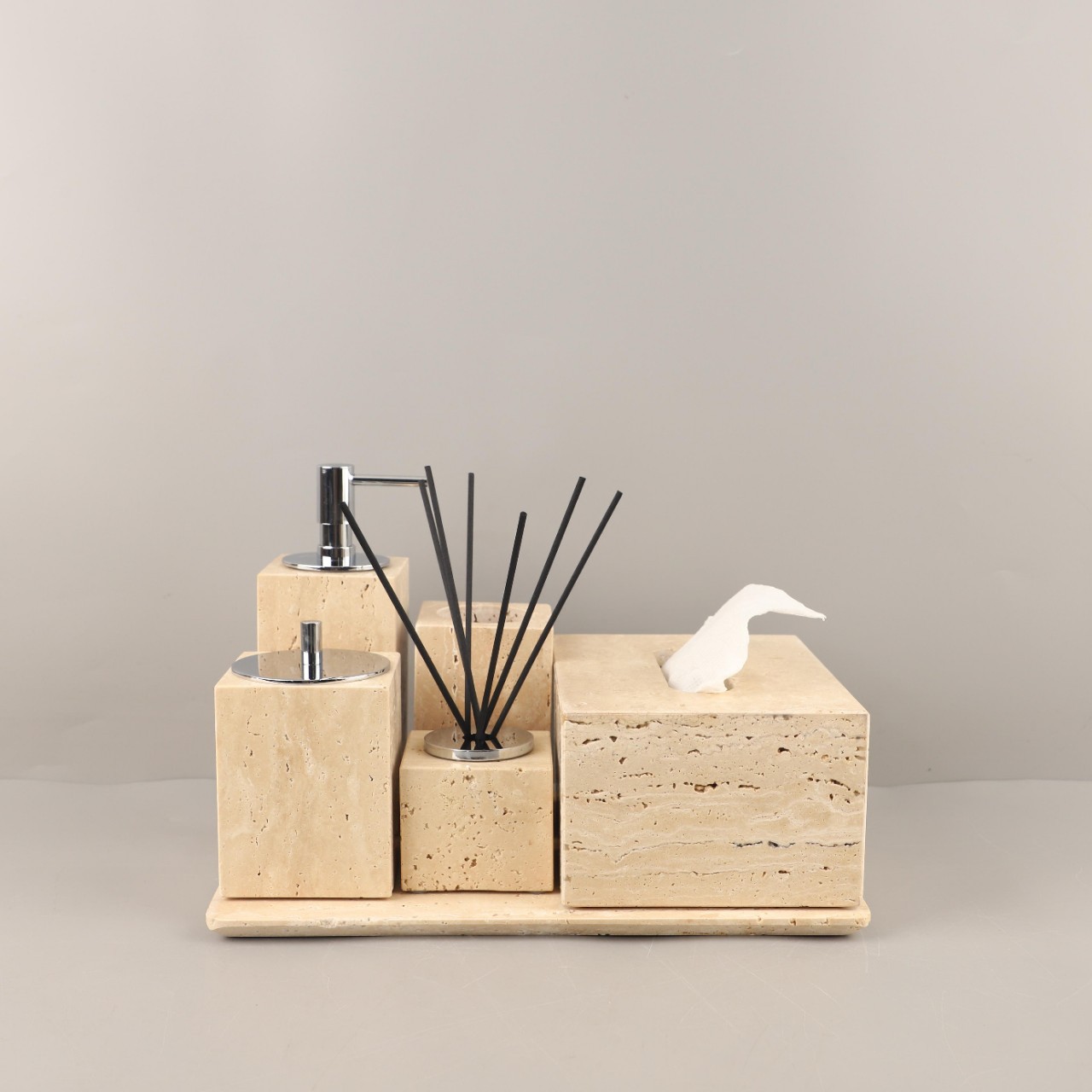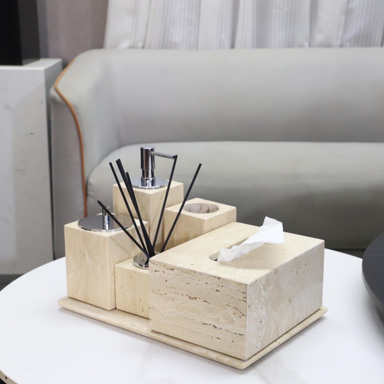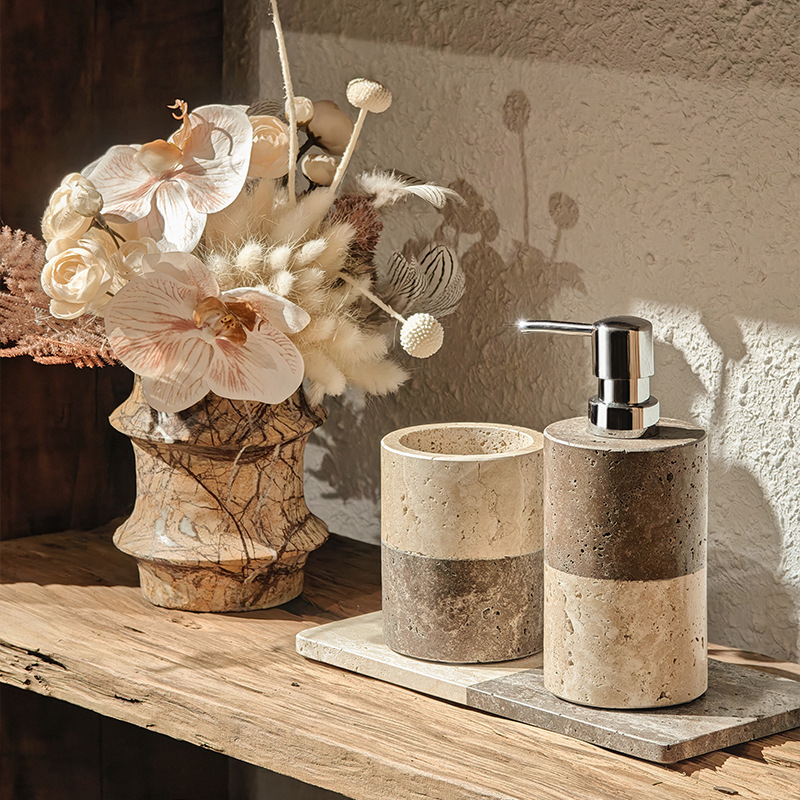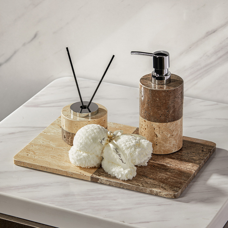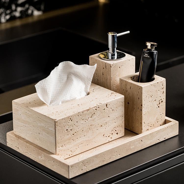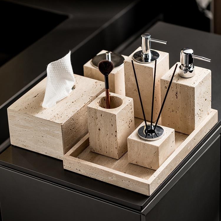 B&B Hotel Model Room Wabi-Sabi Style Bathroom Sink Stone Travertine Lotion Bottle Tray Tissue Box Ornaments