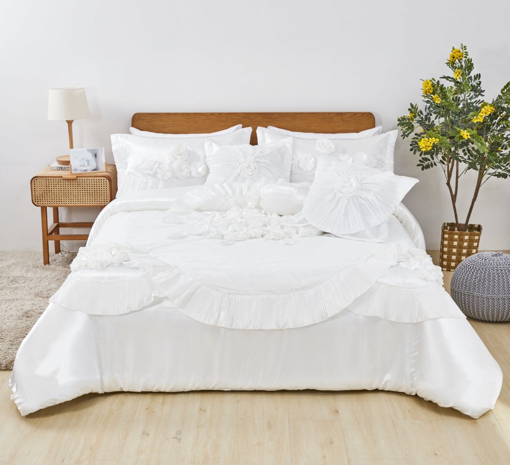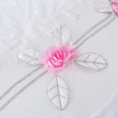 Ruffle Floral Lace Satin White Pink Luxury Delicate Rose Comforter Set (MA125)